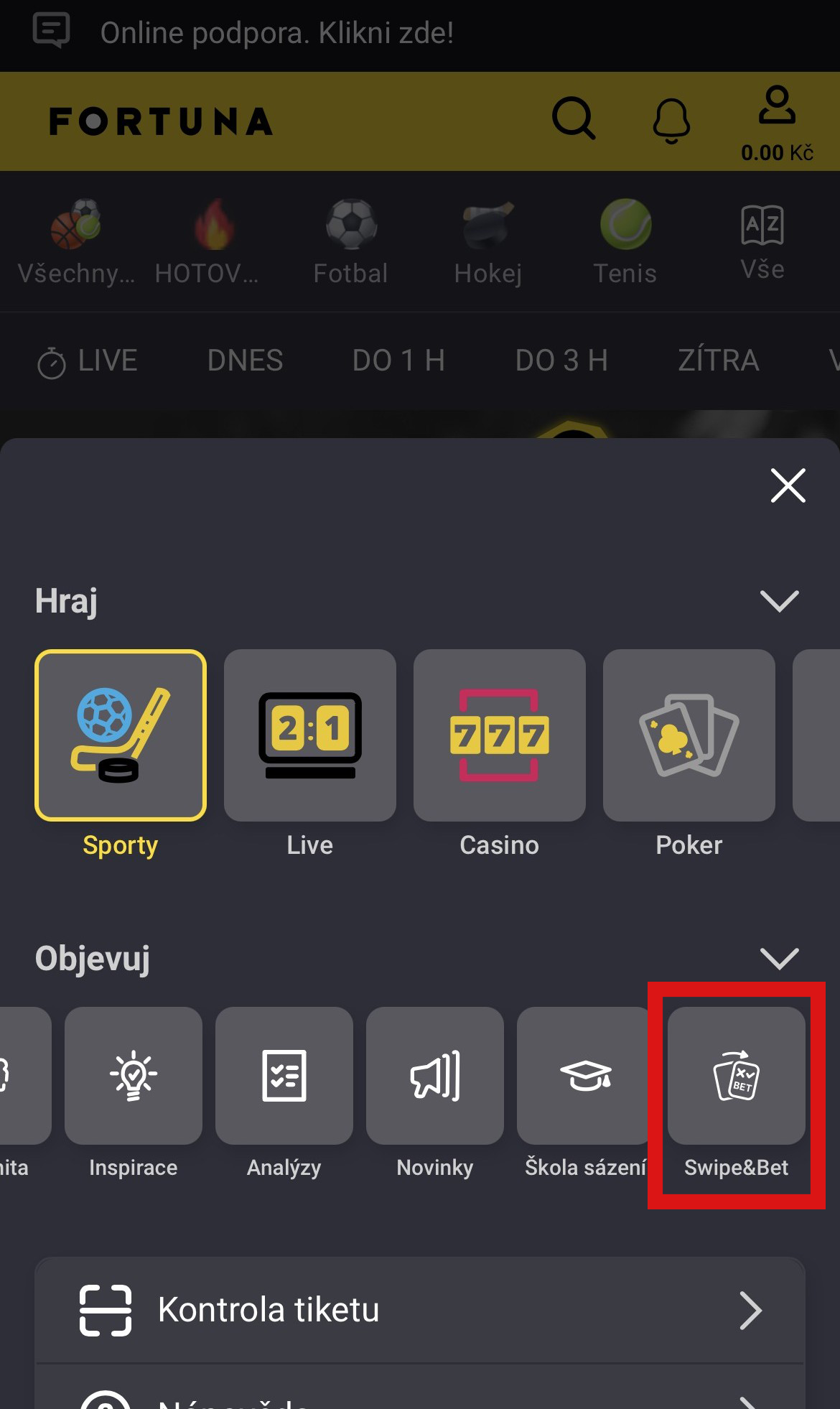 Swipe&Bet najdeš v Menu v sekci Objevuj.